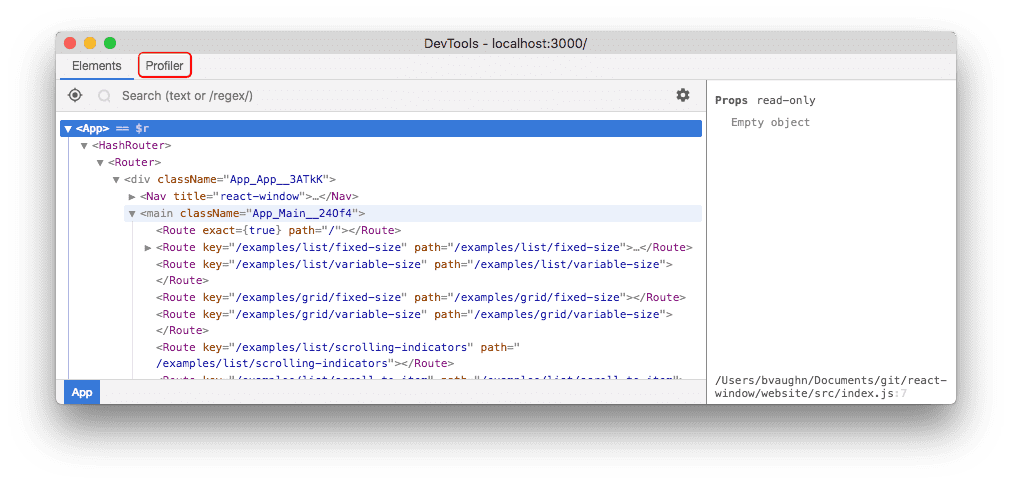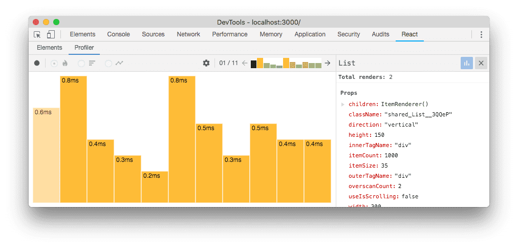 React 16.5 adds support for a new DevTools profiler plugin. This plugin uses React’s experimental Profiler API to collect timing information about each component that’s rendered in order to identify performance bottlenecks in React applications. It will be fully compatible with our upcoming time slicing and suspense features.