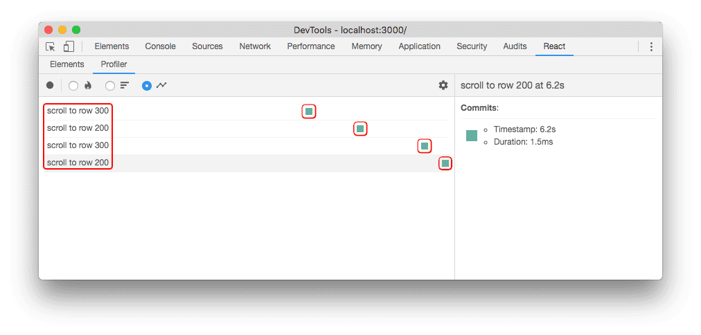 The longer you profile, the more times your application will render. In some cases you may end up with too many commits to easily process. The profiler offers a filtering mechanism to help with this. Use it to specify a threshold and the profiler will hide all commits that were faster than that value.